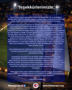 Fethiyespor Kulübü olarak; futbolun birleştirici gücüne inanıyor, bu tür önemli organizasyonlara ev sahipliği yapmanın sorumluluğunu ve gururunu taşımaya devam edeceğimizi kamuoyunun bilgisine saygıyla sunuyoruz.